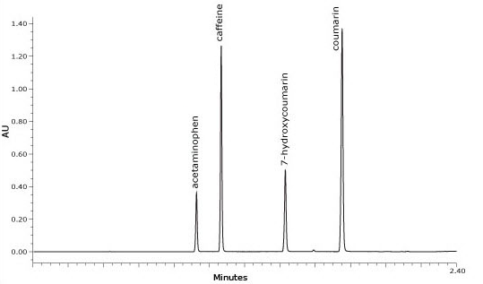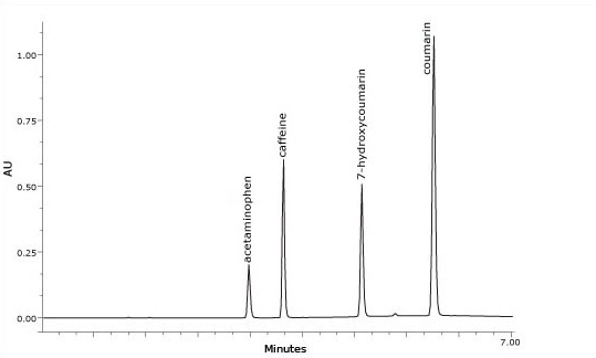 Optimized HPLC separation of acetaminophen, caffeine, 7-hydroxycoumarin and coumarin, USP resolution determined from acetaminophen and caffeine peaks.